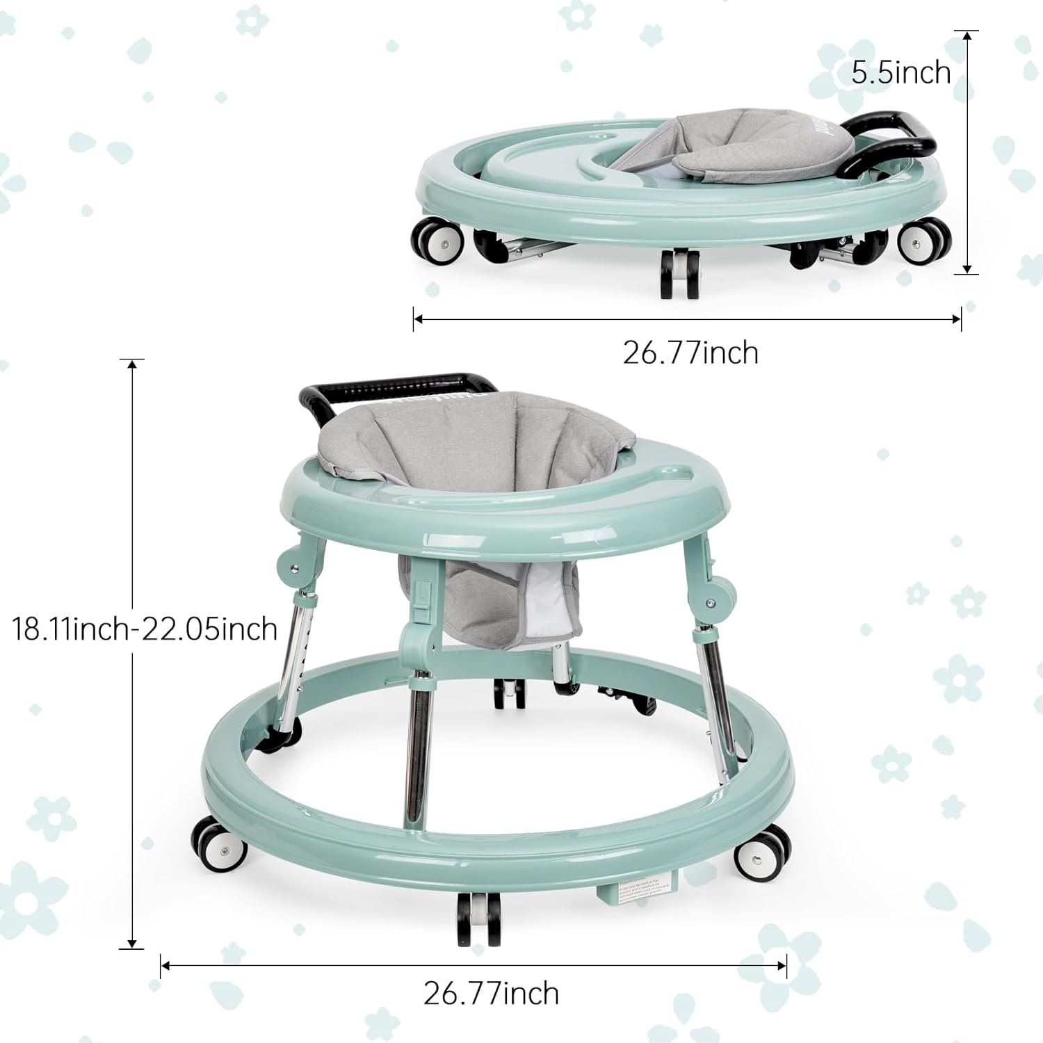 [Foldable storage]: This Baby Walker has foldable support arms that can be easily folded and installed without any tools. At the same time, this baby walker is portable, small and easy to carry and store. Expansion Size: 25.2″(L)*18.11″(W) *”15.75-18.5″(H) for toddlers 7 to 18 months of age. Folded Size: 25.2″(L)*3.94″(H). It can support a 30-pound baby.