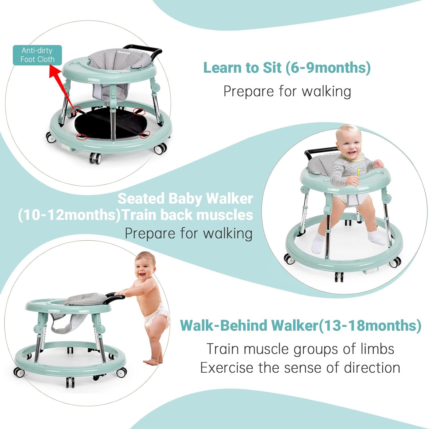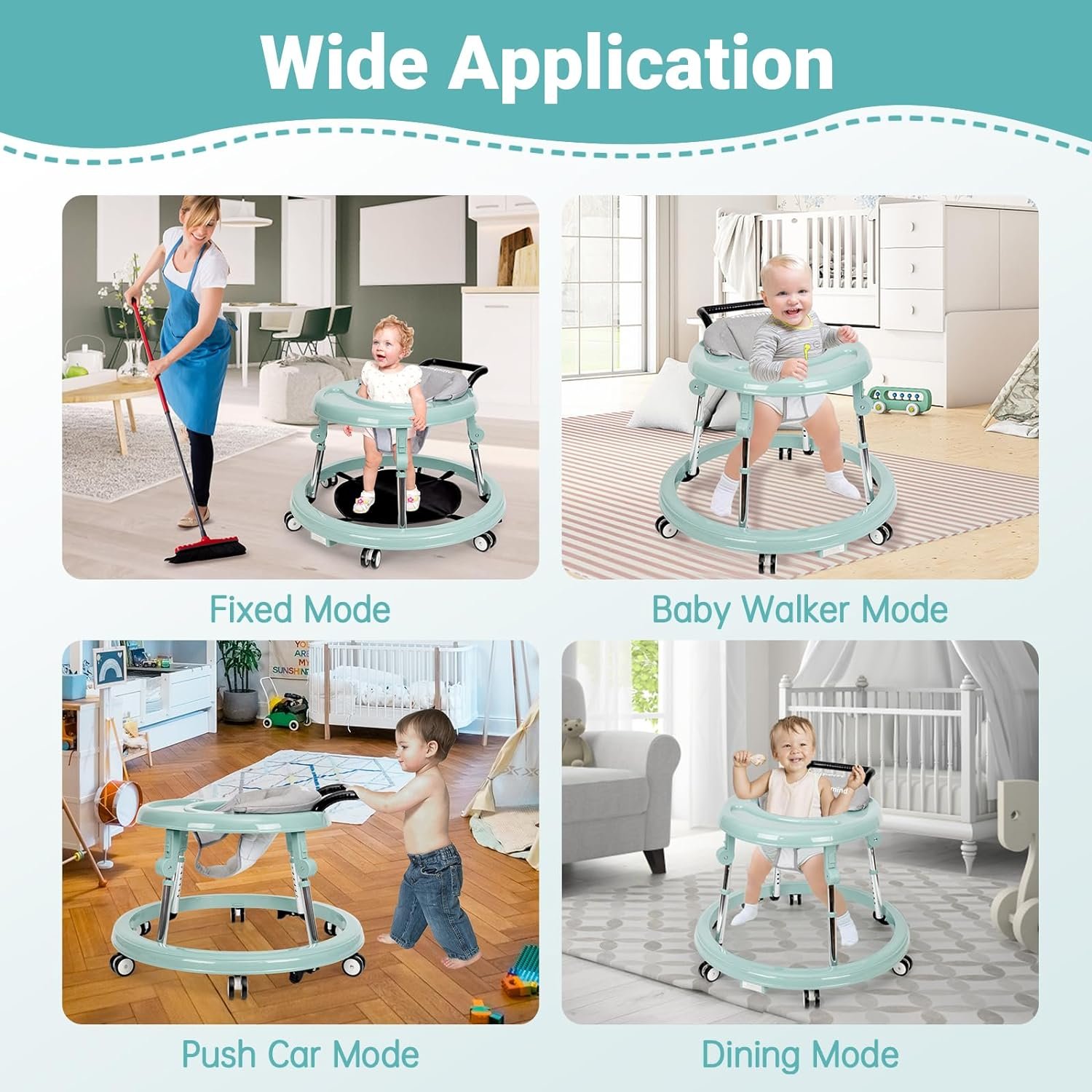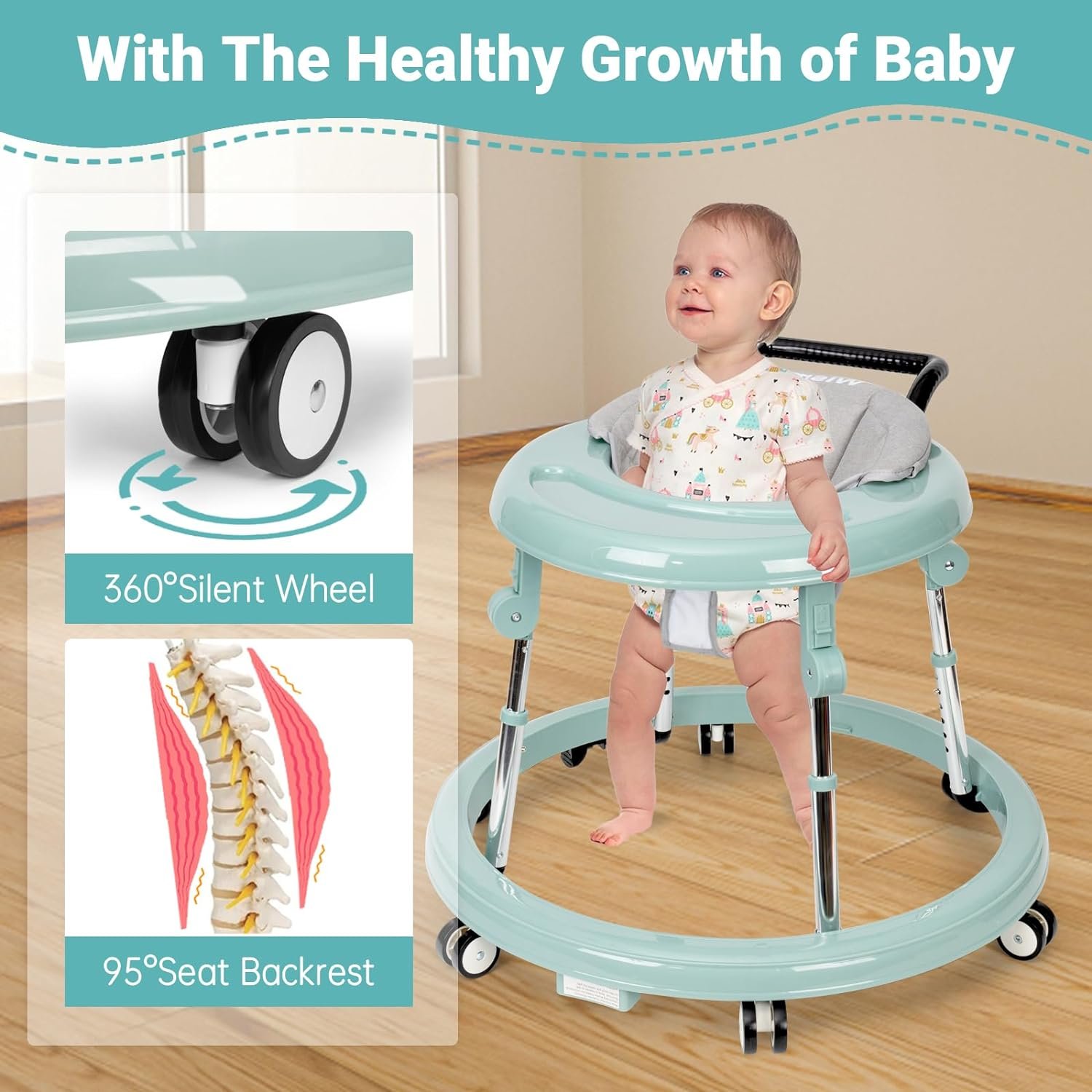 [Wear-resistant silent wheel]: It has 6 x 2 large universal wheels and intelligent multi-direction, so that the baby can move freely 360°. At the same time, its PU soft tread wheels are more wear resistant than ordinary wheels. Therefore, this baby walker with wheels can be noiseless, does not damage the floor, and does not disturb the neighbors sleep.