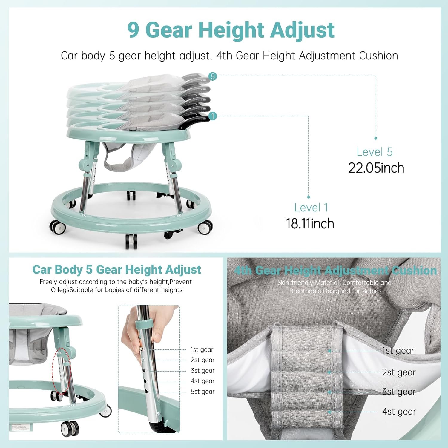 [9 gear height adjustment]: This baby walker for boys and girls have 9 gear adjustment modes, including 5 gear adjustment for the body and 4 gear adjustment for the seat. Adjustable body height: 15.75 inches to 18.5inches. Adjustable seat cushions can provide your baby with extra support and a comfortable tilt. You are free to adjust the appropriate height according to your baby’s height to prevent O-legs.