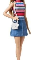 - Barbie doll wears a versatile dress with a colorfully striped bodice and denim skirt paired with white shoes.