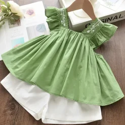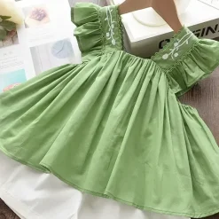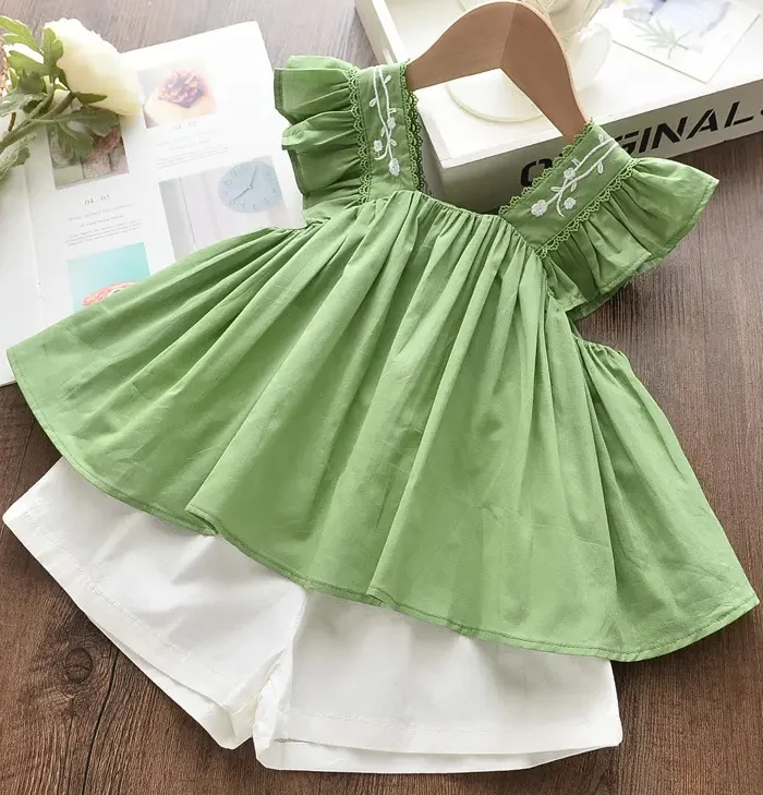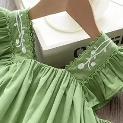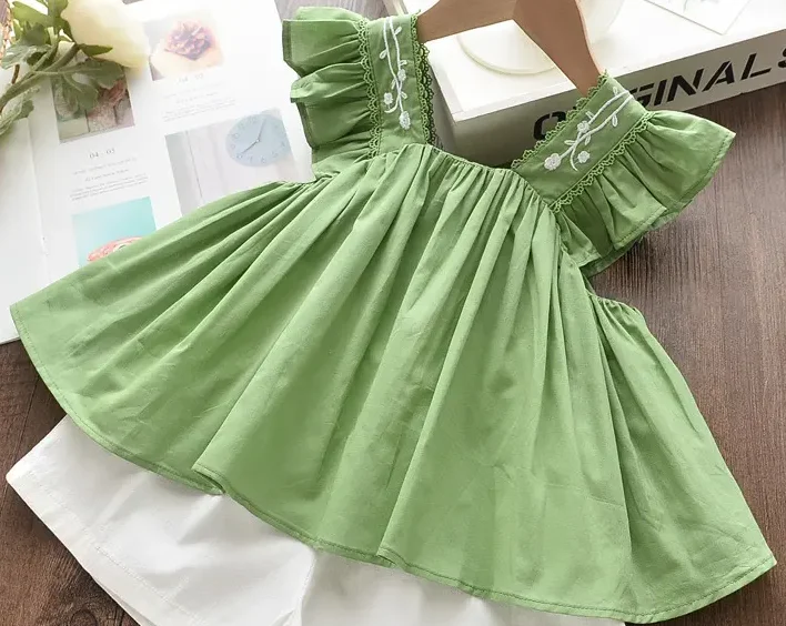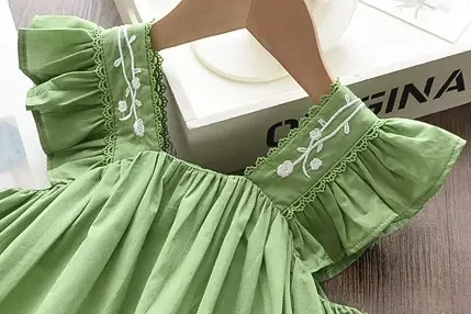 Green Ruffle Sleeve, Embroidered Collar, Flare Design